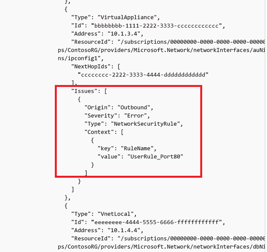 Azure Network Watcher alətlərindən istifadə edərək problemi araşdırın. Məsələn, IP Flow Verify vasitəsilə konkret VM NIC üzrə verilmiş mənbə/təyinat IP və porta görə trafikin icazəli və ya bloklandığını öyrənmək mümkündür. Bu alət trafikin icazə verilib-verilmədiyini və bloklanıbsa məhz hansı NSG qaydasına görə bloklandığını göstərir[2]. Connection Troubleshoot (Şəbəkə bağlantısının sınağı) isə iki nöqtə arasında paketlərin marşrutunu yoxlayır və yol üzərindəki maneələri (NSG, UDR, NVA və s.) aşkar edir[6]. Bu alətin nəticəsində “ConnectionStatus: Unreachable” və Hops siyahısında “Issue: NetworkSecurityRule” və ya “Issue: UserDefinedRoute” kimi qeydlər problemin NSG və ya UDR-dən qaynaqlandığını təsdiqləyə bilər[7].
